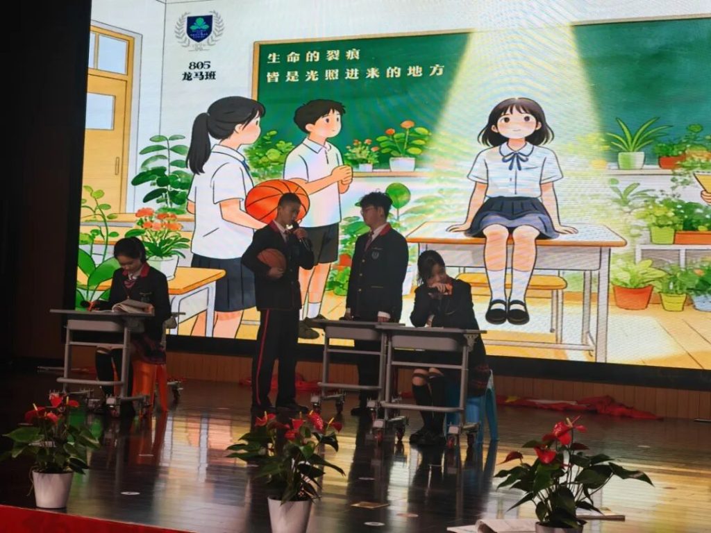 情景剧《生命的裂痕,皆是光照进来的地方》将晨会推向第一个高潮。故事讲述了一位学霸同学因模考失利陷入自我否定,他藏起最爱的绘画本,撕碎画满星空的画纸,觉得自己 “一无是处”。在他最孤单的时刻,后桌同学用琴声默默陪伴,闺蜜带着他曾经画过的 “小太阳” 温暖回望,体育委员用篮球场上的摔打与坚持告诉她 “裂痕终成勋章”,文艺委员用朗读传递生命的热望,班主任则以自己年少时的迷茫与热爱的故事,轻轻点醒了她 ——